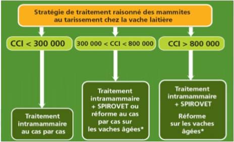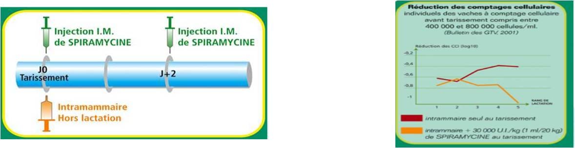 Les études publiées le prouvent depuis longtemps : sur les vaches à C.C.I élevé (supérieur à 300 000 cellules/ml) l’association du traitement intra-mammaire à une injection IM de SPIRAMYCINEréduit significativement les C.C.I au cours de la lactation suivante.